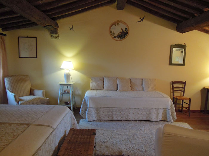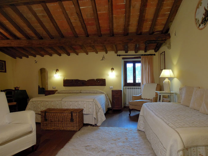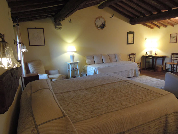 It has windows on the eastern and western sides, an en-suite shower-room, king size double bed and two single beds. Air conditioning.