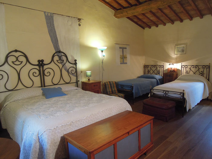 It has windows on the eastern and western sides, an en-suite shower-room, king size double bed and two single beds. Air conditioning.