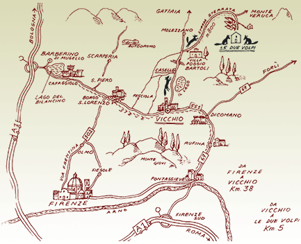 From the Centre and North: Leave the Autostrada del Sole (A1) at Barberino and then drive through the Mugello on road SS 551 to Vicchio. **Then take the road from the main square with the Post Office and central gardens towards Caselle and Molezzano. You will pass Caselle after about 2 kms. Continue as far as a crossroads, which you will find after you have passed over a small bridge. There you should take the unpaved road on the right towards the Medici Villa. Follow the road for about 1 Km until you see a line of silver cypreses on your right. They lead to your destination.
